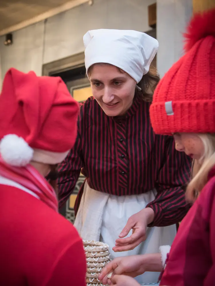 Under store trekroner, med lysslynger og fakler lager vi et flott og stemningsfullt julemarked. Inne i den gamle hovedbygningen fra 1810 blir det julehygge, historiske juletrær, juleforberedelser med mandelkvern og nellikappelsiner på kjøkkenet, julefortellinger ved peisen, og ikke minst jule-allsang i Mjøenfamiliens vakre musikkrom.