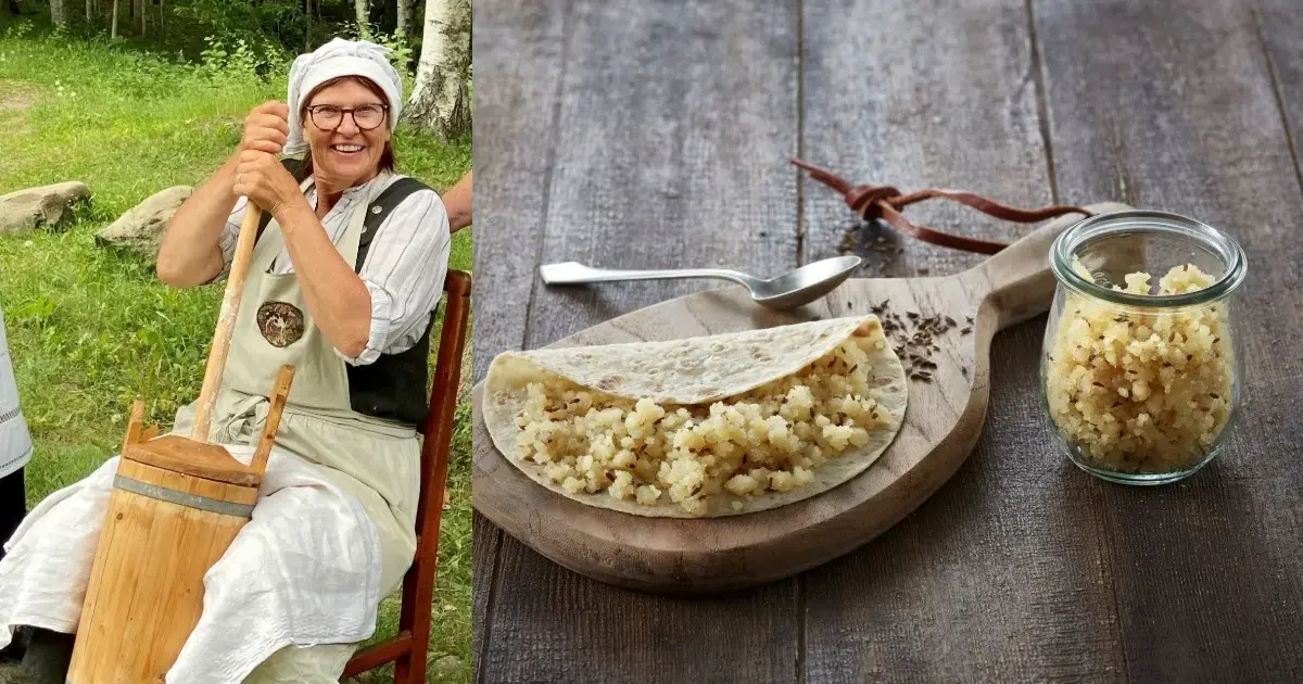 Etter rundturen blir det smaksprøver av lefse med pultost ystet av Marie.